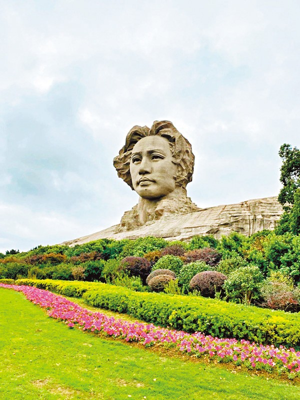忽然下起雨来,淅淅沥沥,使橘子洲更具诗情画意。景区介绍说,1960年橘子洲建成14公顷的橘洲公园,1962年对外开放。后更名岳麓山风景名胜区橘子洲景区,不啻为国家5A级景区,更是全国红色旅游经典景区和爱国主义教育基地。我浏览了诗词碑、颂橘亭、“谁主沉浮”雕塑广场等景点。岛上最令人瞩目者当是高32米、长83米、厚41米的毛泽东巨雕头像,这尊钢筋混凝土结构、外表花岗岩石材的雕像,以青年毛泽东形态为基调,突出一代伟人风华正茂、胸怀奇志的光辉形象,气势恢宏、形神皆备,令人高山仰止!