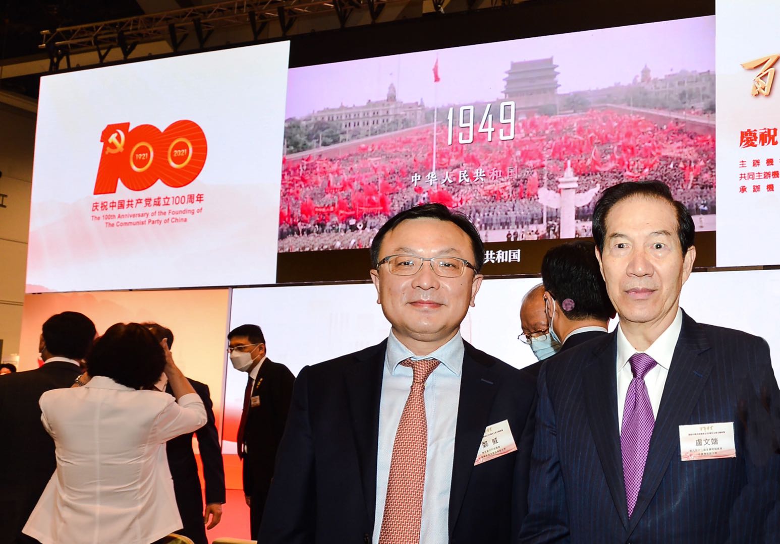 7月3日,由中联办、香港特区政府主办,紫荆文化集团、中国国家博物馆共同主办的“百年伟业--庆祝中国共产党成立100周年大型主题展览”在香港会议展览中心盛大开幕。走进展馆,一张张弥足珍贵的历史照片映入了参观者的眼帘,诉说著中国共产党百年的奋斗征程。刚于7月1日公布获颁授2021年大紫荆勋章的中国侨联副主席卢文端先生受邀请出席当日开幕仪式后,在青少年军导赏员的引领下参观了展览,在近千张展览照片中,被誉为“华侨旗帜 民族光辉”的陈嘉庚先生的老照片就有三幅,引起了在场华人华侨的驻足和交谈,卢文端先生更是长时间的驻足和追忆,其中一张照片是陈嘉庚与毛泽东主席的合照。这张照片拍摄于1949年,陈嘉庚先生前往北京会见毛泽东主席,两人在北京中南海勤政殿前合影。当时,新政协筹备会开幕,处处以国家、民族利益为重的陈嘉庚先生作为华侨首届代表和侨界召集人,已下定决心参加新政协筹备会,共商建国大计。