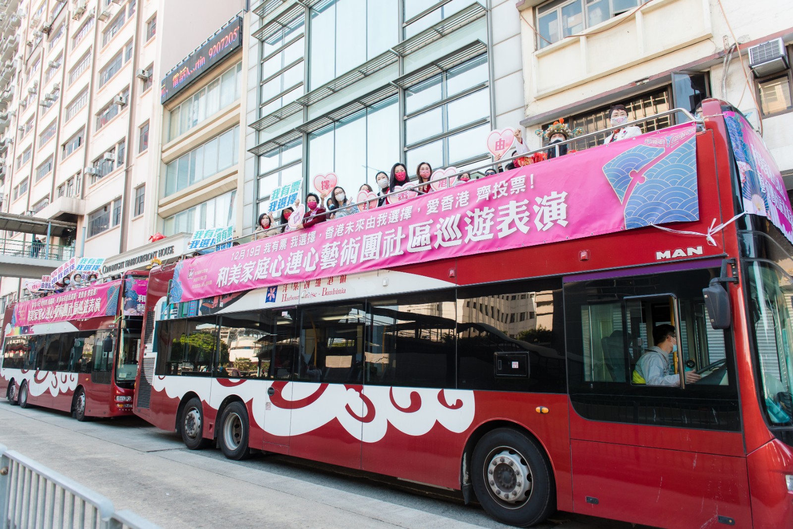 11月14日起连续五个周日,由“香港岛妇女联会”丶“和美家庭心连心艺术团”、“与爱同行义工团”联合举办的“和美家庭心连心艺术团”社区巡游表演以音乐为港岛社区送上欢乐及正能量。活动邀请各界贤达,知名人士及明星连同艺术团团员带同小朋友共同展开巴士巡游演出,获得了积极反响。近千人次的义工参与了活动,多个妇女团体应邀出席,互相交流学习,使活动越办越精彩、气氛一次比一次热烈。连续五个周日,“和美家庭心连心艺术团”通过花车巡游的方式,且歌且行,把音乐艺术送到市民身边,让市民把开心快乐带回家,促进家庭和美。同时通过“香港印象 旗袍剪影”活动,透过“和美家庭推广大使”,展开女性压力和生活问题的调研,汇集女性期望和诉求,为女性发声。因为期望香港的明天更美好,希望唤起女性在社会事务上发挥更积极的作用,主办方亦在活动中以“香港未来 由你选择”, 呼吁广大市民行使公民权利,尽公民责任,在12月19日以手中神圣的一票为香港选择未来。“香港岛妇女联会”发动各属会协助支持活动,设立旗袍打卡活动点。在各区属会、友会的协同之下,巡游路线图覆盖香港岛、东涌各大社区,鼓动起市民关注社会问题,参与社会事务的热情。南区各界妇女活动委员会、香港东区妇女联会、华夏正心坊、愉景湾华夏舞蹈队等团体更在不同社区展开了与“香港岛妇女联会”协同的各具特色的巡游。