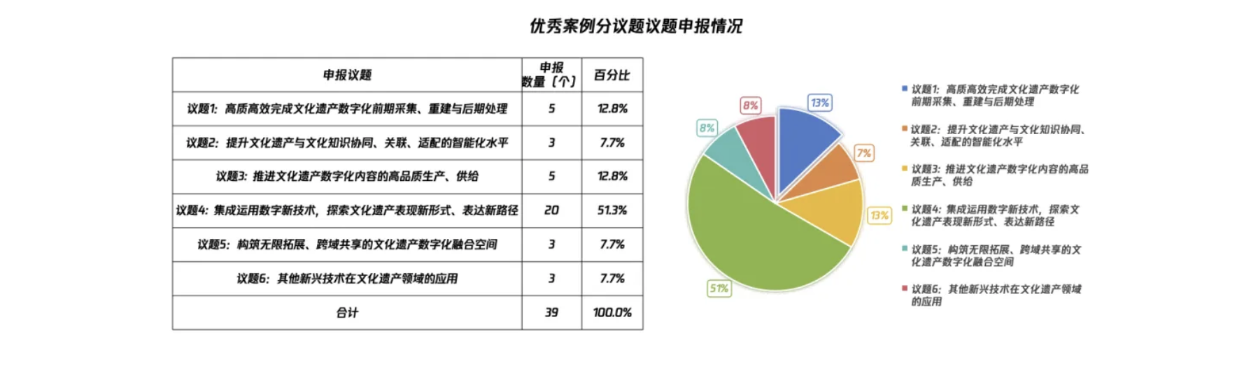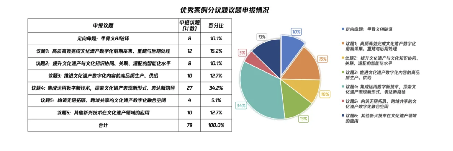 议题申报分布情况显示,集成运用数字新技术,探索文化遗产表现新形式、表达新路径成为申报的焦点,占比达到34%,反映出新思维、新技术、新模型在文化遗产领域应用的探索热情。