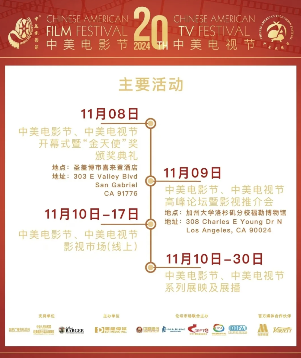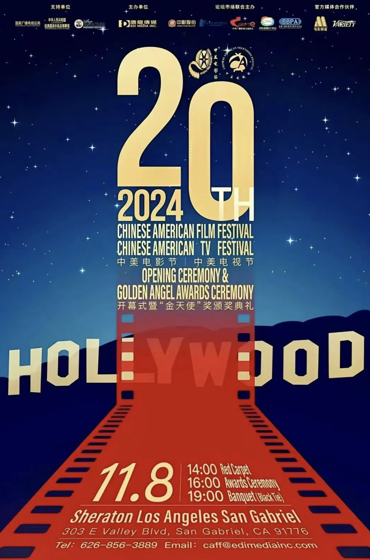 由美国鹰龙传媒公司主办,中国国务院新闻办公室、中国国家电影局、中国国家广电总局、中国驻洛杉矶总领事馆、美国洛杉矶郡政府共同支持的 2024 第二十届中美电影节|中美电视节开幕式暨“金天使奖”颁奖典礼于 11 月 8 日在美国西岸洛杉矶盛大举行。