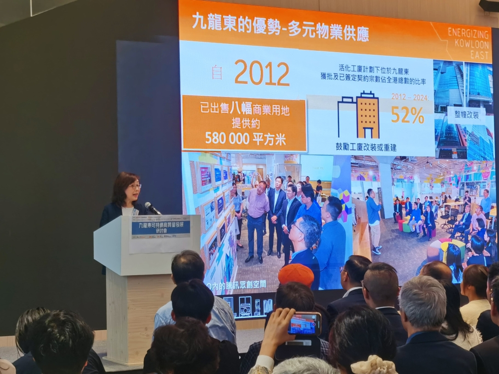 局长在致辞时表示,政府于2011年宣布将九龙东转型为香港第二个核心商业区(CBD2),经过十多年的努力,透过起动九龙东政策的实施和启德发展区规划的落实,九龙东经已逐步成为香港第二个核心商业区。区内的跨国金融及商业服务企业数量不断增加,商业楼面面积在过去10年增加一倍至现时超过370万平方米。面对目前香港商业楼面较为充裕,政府会审时度势,以务实态度在合适时间推出区内已经规划的其他商业用地。九龙东稳定而充足的商业楼面供应,加上优质楼面但租金较为相宜的特色,有助巩固其核心商业区的功能,以配合香港「八大中心」中国际金融及商业服务业的定位,并成为粤港澳大湾区作为国家新发展格局高质量发展的示范地。