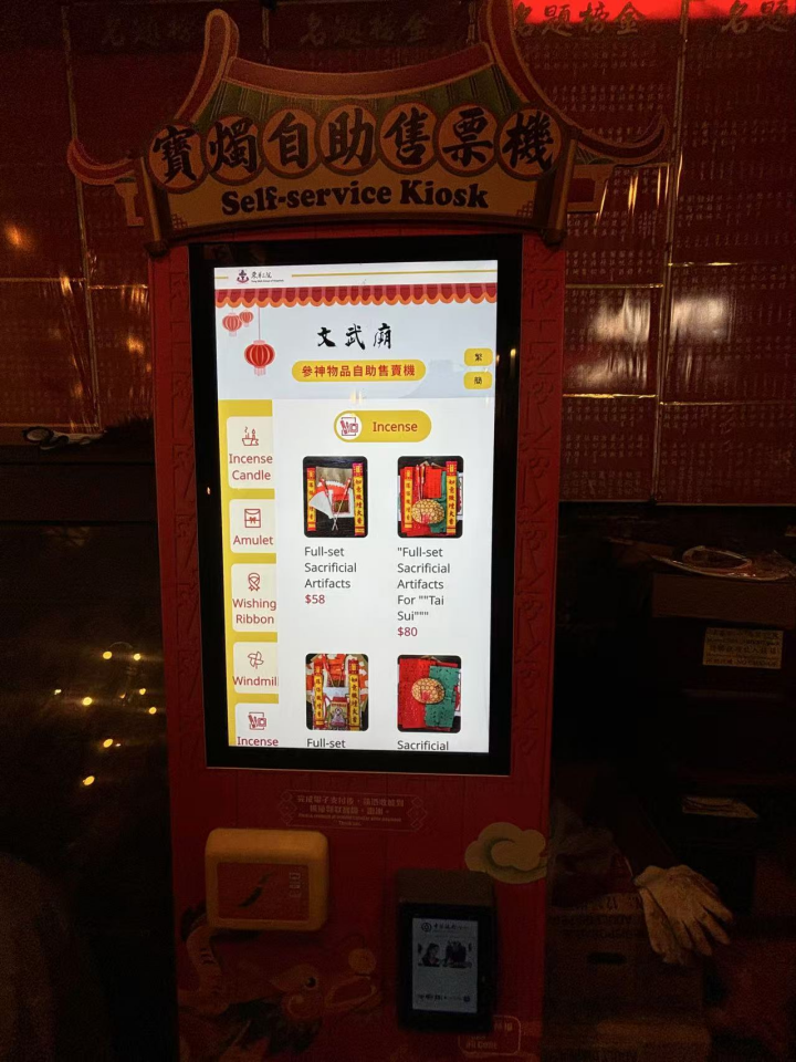 上环文武庙近日引入了全港首批宝烛自助售票机,为参拜善信提供更方便的祭祀用品购买途径,从此无需再排队,便可轻松选购多种参神物品,包括各类香烛、护符、祈福丝带、风车、宝烛等。购买后,善信可选择将单据交予庙宇职员加盖祝福印章,并装入透明套内,使单据成为具纪念价值的收藏品。