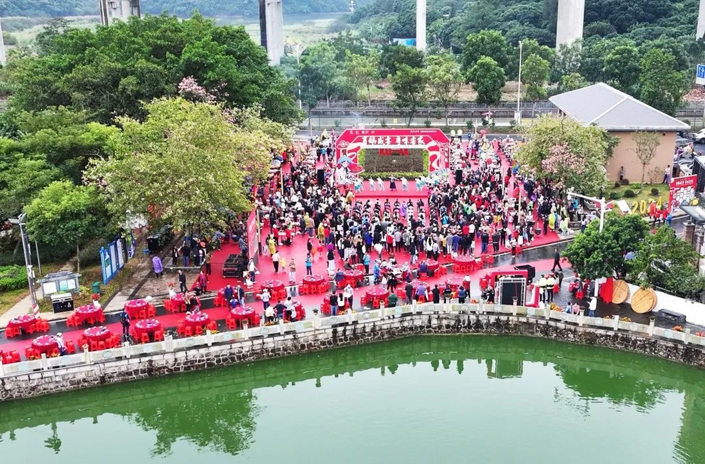 活动在客家山歌和客家麒麟舞表演中拉开序幕。点火!”伴随著鞭炮齐鸣,百名“民间大厨”点炉开火,采用柴火土灶的传统方式,同时烹饪各具特色的百只焖年鹅。