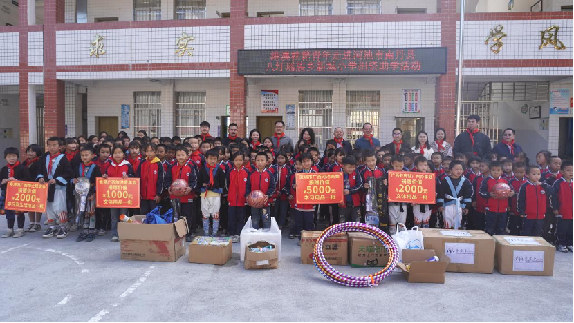 11月22日,广西河池南丹县八圩瑶族乡新城小学迎来了一场别开生面的捐资助学志愿服务活动,由广西政府驻广州办事处主办,香港广西旅港青年会、粤港澳广西博士联谊会、深圳市广西河池商会及澳门城市大学广西校友会等爱心单位共同发起,旨在助力进一步铸牢中华民族共同体意识,为民族地区教育事业注入新活力,共筑民族教育梦。