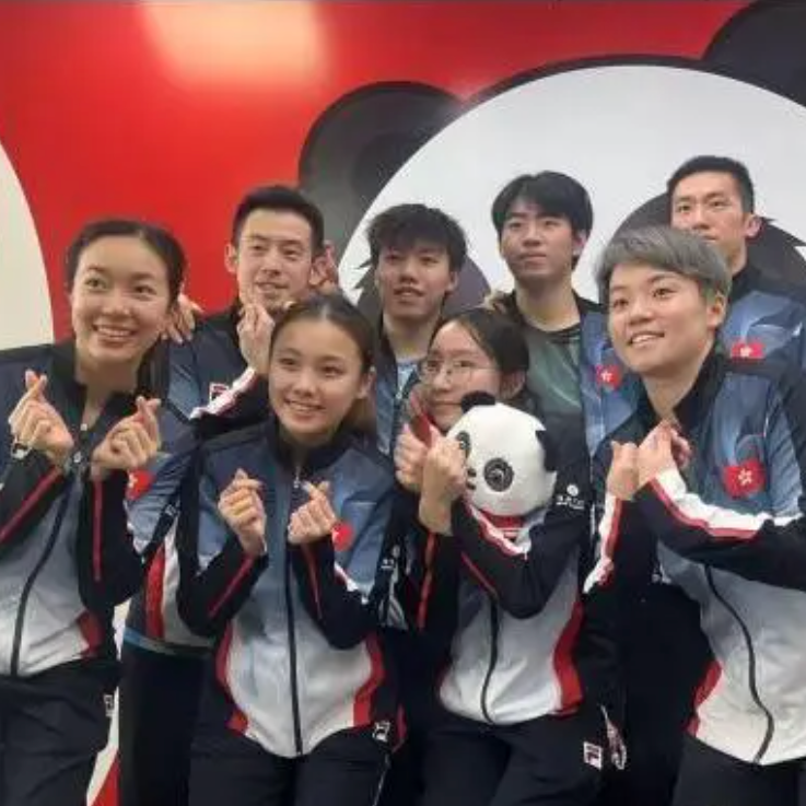 赛后中国香港队心情大好,在大熊猫画像前比划着黄镇廷女儿最爱的“LOVE”手势开心合影。
