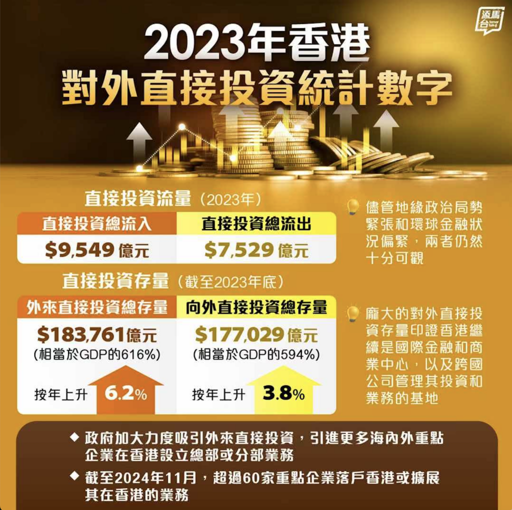 截至2023年年底,香港的外来直接投资和向外直接投资总存量十分庞大,分别达183,761亿元及177,029亿元(相当于本地生产总值的616%及594%),为全球其中一个主要的对外直接投资目的地及来源地。庞大的对外直接投资存量印证香港继续是国际金融和商业中心,以及跨国公司管理其投资和业务的基地。