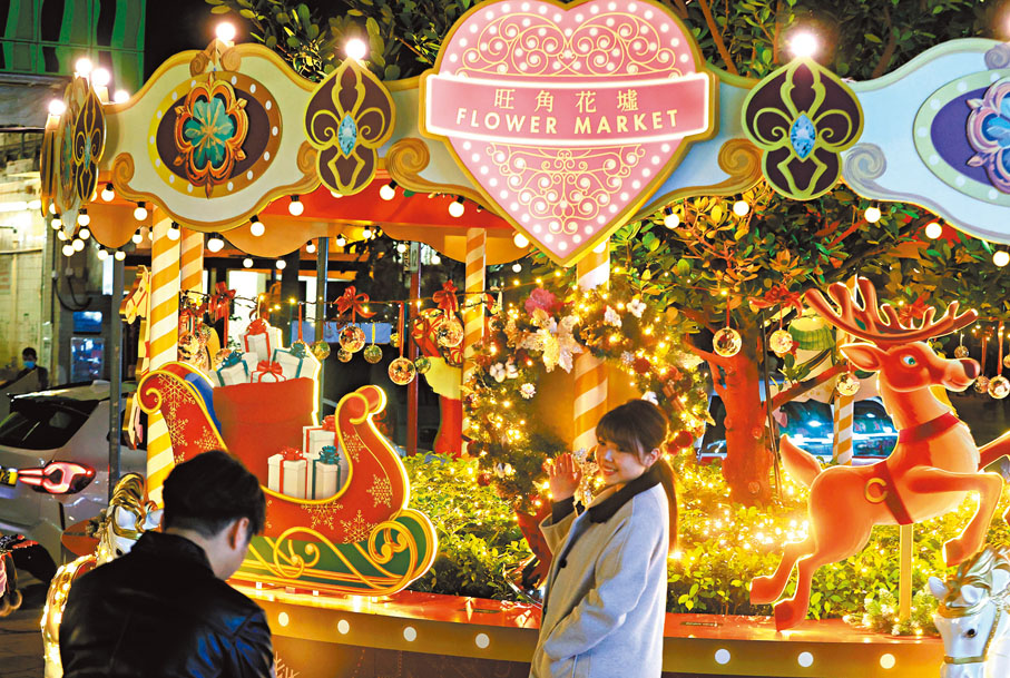 圣诞灯饰方面,市建局与油尖旺民政事务处合作,于本月13日至明年1月5日,在花墟举办“万花同庆”圣诞节庆活动,在洗衣街与花墟道交界的行人空间,设置以旋转木马为主题的大型圣诞装置,并配合圣诞花环和圣诞鹿等装饰,供市民和游客打卡。另在洗衣街部分路段,装上亮丽的圣诞灯饰,营造火树银花景象,并与花墟道以万花筒图案设计的大型横额和金光闪闪的灯饰互相辉映,为晚间花墟,增添节日氛围。