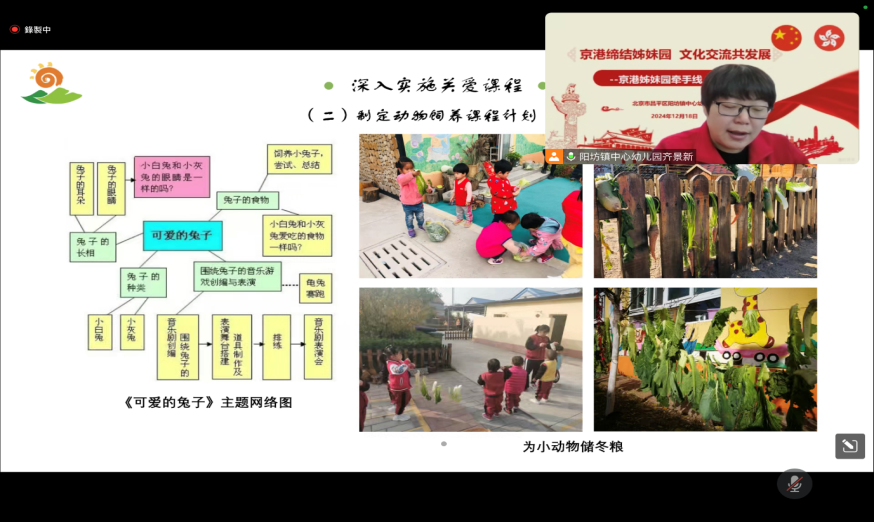 接著,北京市昌平区阳坊镇中心幼儿园与香港西区妇女福利会幼稚园针对培养幼儿爱护动物的态度进行交流研讨。北京市昌平区阳坊镇中心幼儿园的教师代表分享了校园里养育山羊与小兔子的故事。教师更是因应黄羊宝宝、兔宝宝的出生,为幼儿设计了一系列关爱课程。例如,讨论羊宝宝出生后面对的问题;幼儿们在老师的引导下,承担起喂食、清洁的责任;召开为小动物储冬粮、收集旧棉衣、被子的活动;开展以兔子为主题的手工活动等。香港西区妇女福利会幼稚园则分享了透过参与警务处“动物守护大使计划”,加强了幼儿爱护动物意识的经历。其中,“宠爱阁”是该计划的一项重点,透过在校园内饲养甲虫,委任学生为“动物守护·学生大使”,令学生肩负起照顾动物的职责。此外,香港西区妇女福利会幼稚园亦邀请萤火虫协会到校,令孩子们近距离观察萤火虫,由浅入深地增加学生对萤火虫的认识,从而理解气候变迁对生物多样性的影响。