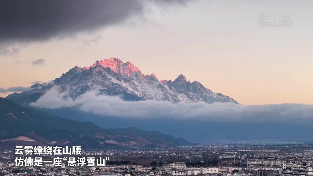 1月9日,经历2025年第一场雪后,云南丽江玉龙雪山白雪皑皑。云雾缭绕在山腰,仿佛是一座“悬浮雪山”。雪山在晨曦中和丽江古城“同框”,绘就了一幅绝美画面,令人流连忘返。