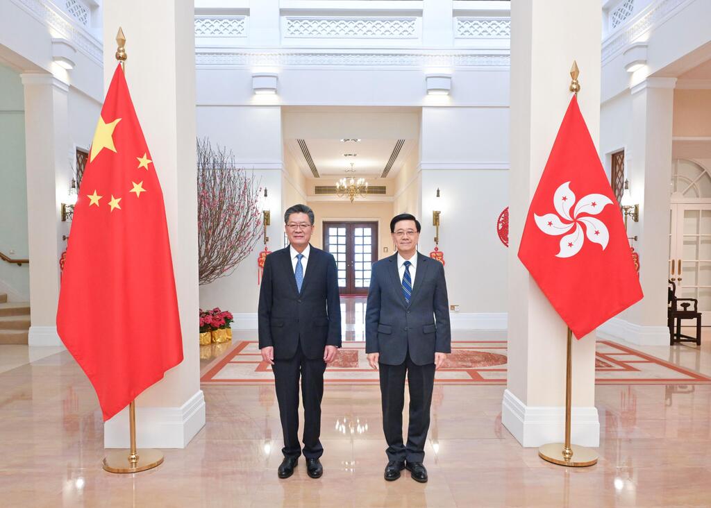 行政长官李家超昨日(二月十四日)在礼宾府与广州市委书记郭永航会面,就深化香港和广州市合作交流意见。政制及内地事务局局长曾国卫和行政长官办公室主任叶文娟亦有出席。
