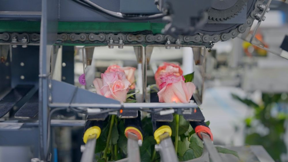 在园区采后处理中心,鲜切花玫瑰采摘后迅速预冷保鲜,去刺去叶后,红外成像识别系统检测花朵开放度、枝干长度及粗细,并按等级分类。随后,自动化设备完成捆扎与包装。标准化作业使效率提升30%。通过保鲜剂与冷链技术处理,鲜花瓶插期可延长7至10天。每束鲜花附有专属二维码,消费者扫码即可追溯生产全流程,确保品质透明可信。