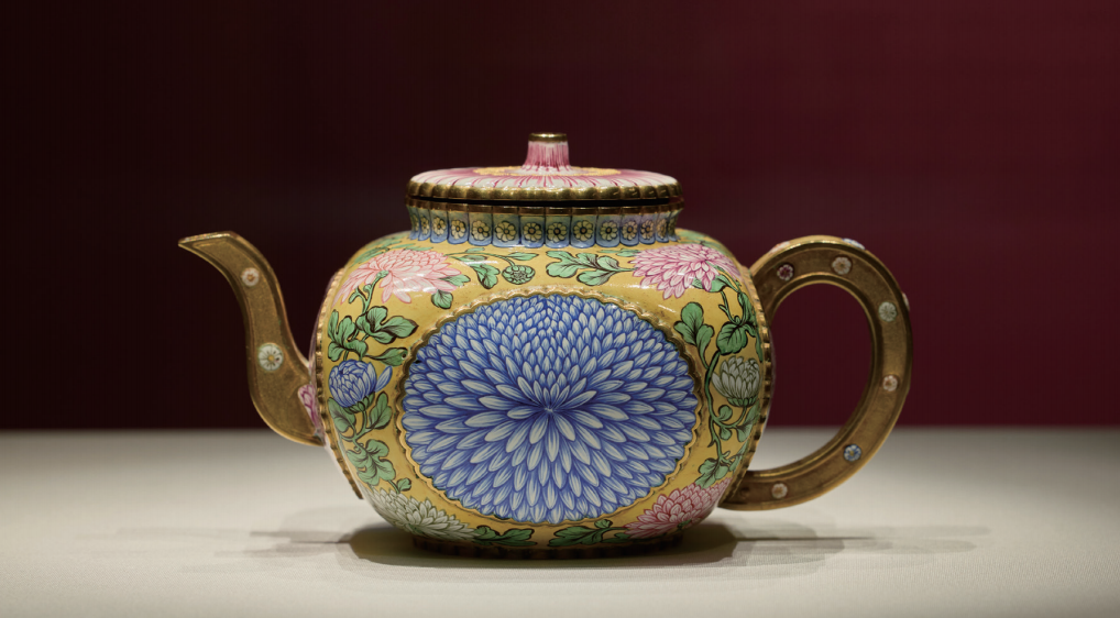 菊花纹壶采用画珐瑯工艺,法国作此类器物通常以金胎为基底。据现有考证,乾隆皇帝曾下令向欧洲订购珐瑯器,这批器物出自18世纪巴黎著名的珐瑯工艺师约瑟夫.科托之手。他曾为法国国王和王室显贵服务,在这次订单中则被要求在中国器型之上进行创作。
