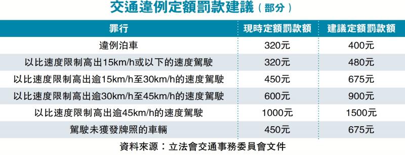 香港特区政府昨日(17日)向立法会交通事务委员会提交文件,建议调整多项交通违例事项的定额罚款及路边咪表收费水平。其中俗称“牛肉乾”的违例泊车罚款额,建议由现时320元调高至400元;超速驾驶、没有遵从交通标志和道路标记、驾驶时使用流动电话等19项交通违例罪行,罚款额由现时320元至1000元不等,调高至480元至1500元不等,以加强罚则的阻吓作用,预计立法会完成审议修订后约三至六个月内陆续实施。
