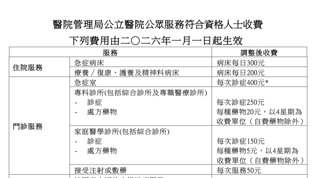 医院管理局公布,适用于合资格人士的公立医院公众服务新收费表刊宪,新收费明年1月1日正式生效。