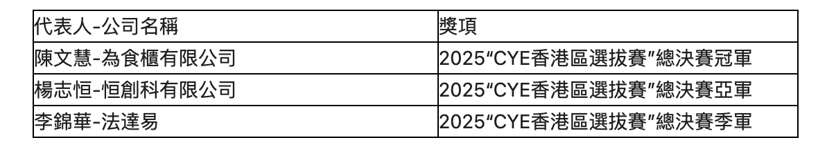 2025“Creative Young Entrepreneur (CYE)创意青年企业家”香港区选拔赛总决赛(“CYE香港区选拔赛”)今日(四月二十七日)在东蒲圆满举行,中国香港代表经已诞生,当中为食柜有限公司代表陈文慧、恒创科有限公司代表杨志恒和法达易代表李锦华分别夺得2025年“CYE香港区选拔赛”冠军、亚军及季军,将会代表中国香港参加6月于国际青年商会亚洲及太平洋区会议举行的CYE亚太区选拔赛。主办机构国际青年商会中国香港总会会长王师尧恭贺三位得奖者,他说:“今天参赛者有来自不同届别的青年企业家,包括科技及人工智能、环境及绿色产业与可持续发展、长者服务、无人零售、酒店及旅游业、医疗及健康护理等等,当中不乏充满创意及潜力的点子,他们的创业理念同时会想尽办法为社会作出贡献。国际青年商会连系全球114个国家地区,期望中国香港代表能够透过CYE 踏入世界舞台的第一步,在国际青年商会亚洲及太平洋区会议胜出,为中国香港增光。”2025“CYE香港区选拔赛”总决赛有来自中国香港各行各业的优胜队伍参赛。中国香港代表队伍获得奖项如下: