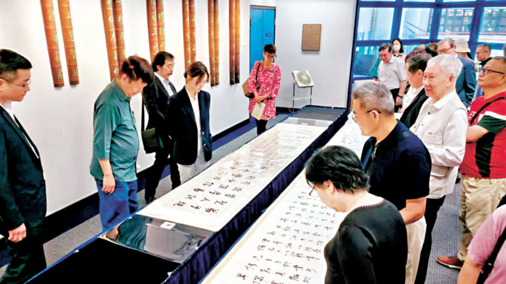“墨韵流芳”施子清九秩寿庆书法展12日于香港科技大学曾肇添展艺厅举行开幕礼。年届九旬的香港大紫荆勋贤、中国书协香港分会主席施子清亲临致词,强调书法进校园及书法教育的必要。施子清在现场为即将到来的港科大35周年校庆赠送自己书写的“创新精神成就可能”,尽显创新精神。港科大亦送出校园地标纪念品及施子清隶书书法“寿”字的生成式AI作品为施子清九十岁生日庆贺。