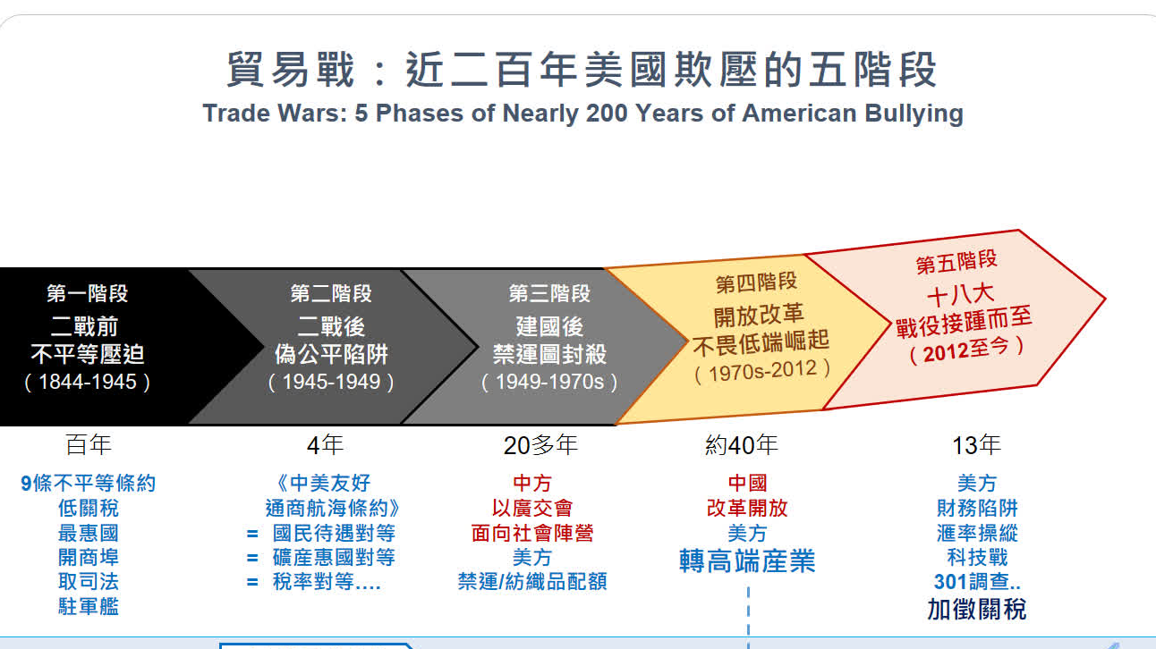 新中国成立后,美国出于意识形态对立,联合盟友对中国实施全面禁运封锁,并于1949年主导成立“巴黎统筹委员会”,于韩战期间严格限制成员国对华出口战略物资和高技术产品,妄图扼杀新中国的经济发展。直至1972年尼克松访华后,两国关系少开始走向正常化;此外,美国亦同时采用另一贸易战模式,实施“纺织品配额制”单边措施,限制他国的纺织品出口,对中国香港的限制开始于1959年,长达近半个世纪的2005年才结束。