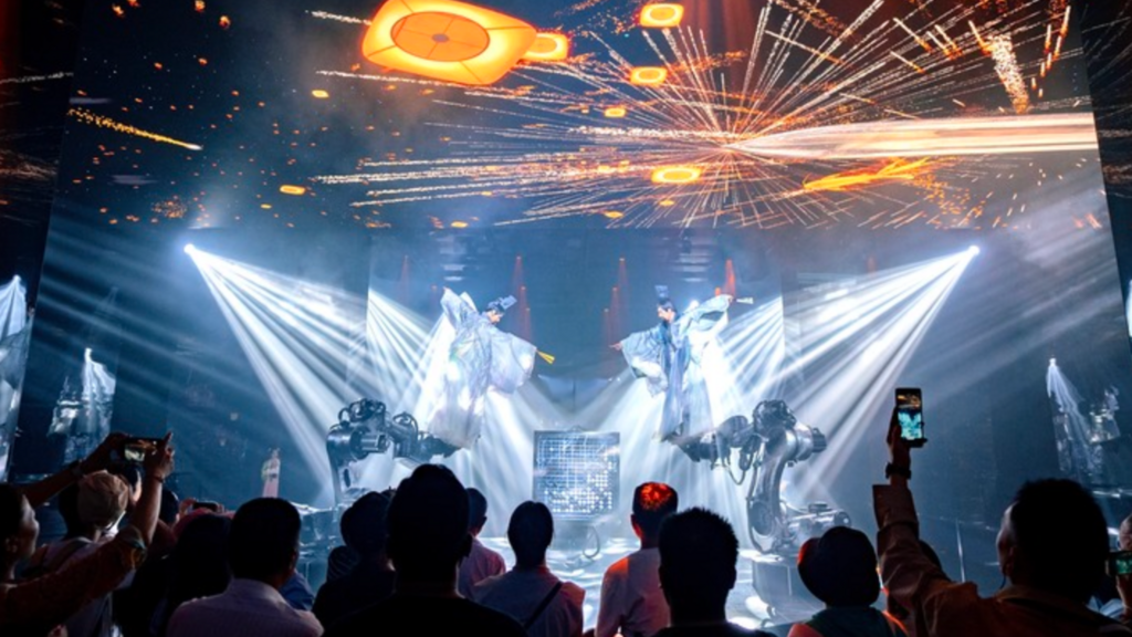 沉浸式科技空间秀《爱雅宋》,将实景构建与虚拟现实技术巧妙结合,以“琴”“棋”“书”“画”“天问”五重场景,创新表达宋代美学;《飞越清明上河图》球幕影院里,借助数字技术打造5D视效,游客仿佛“步入画卷”、穿越千年,一览昔日东京汴梁城的繁华盛景……