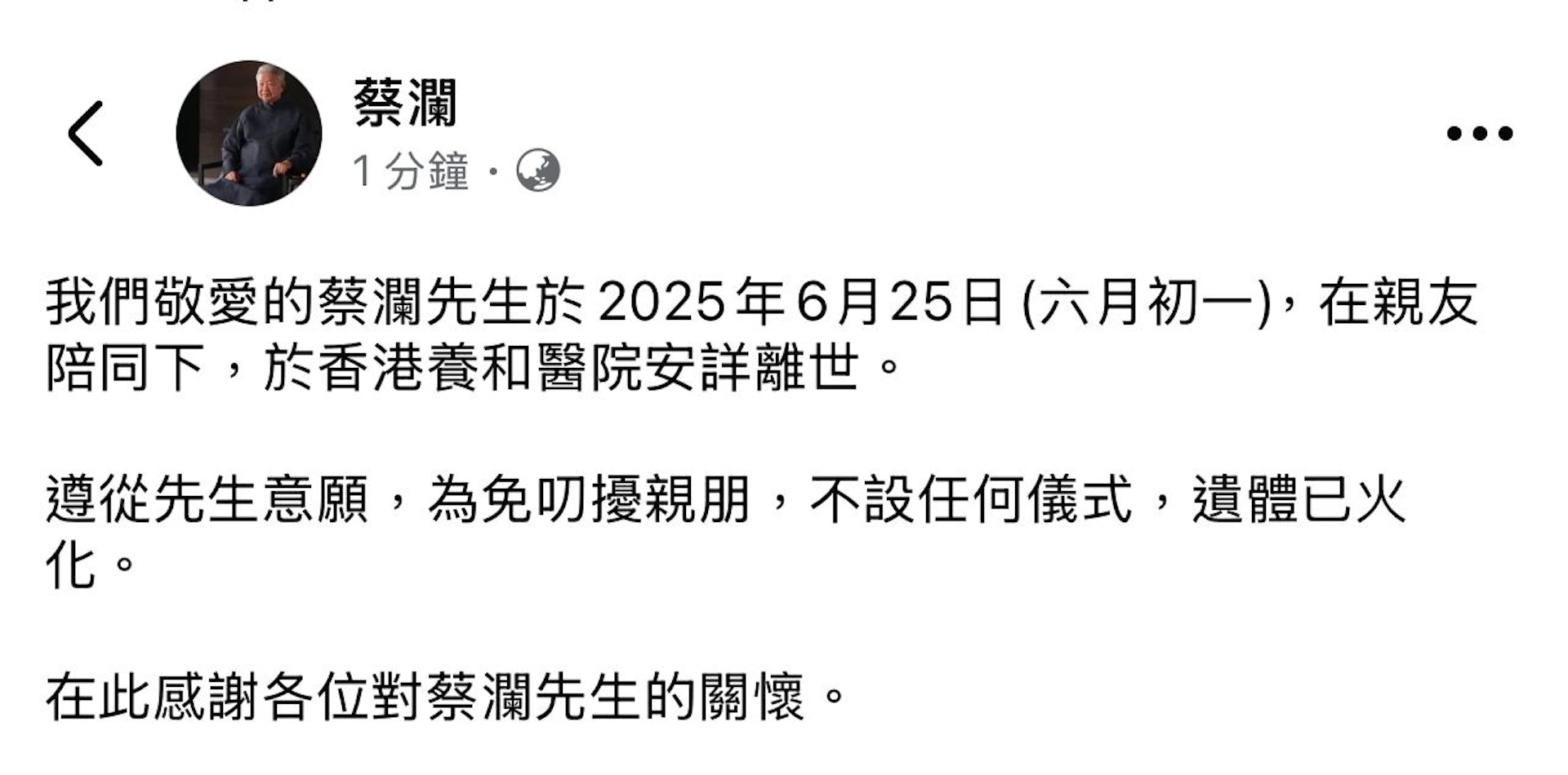 被誉为“香港四大才子”之一的蔡澜今日传出离世消息,蔡澜的社交媒体写道:“我们敬爱的蔡澜先生于2025年6月25日(六月初一),在亲友陪同下,于香港养和医院安详离世。遵从先生意愿,为免叨扰亲朋,不设任何仪式,遗体已火化。在此感谢各位对蔡澜先生的关怀。”