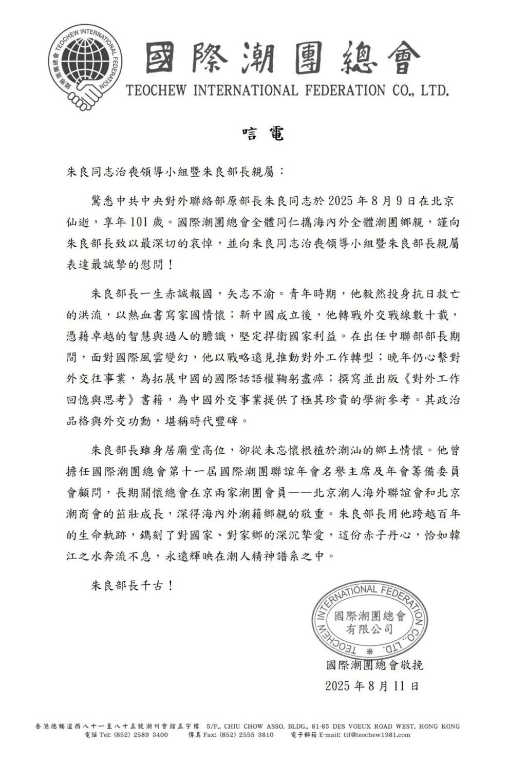 惊悉中共中央对外联络部原部长朱良同志于2025年8月9日在北京仙逝,享年101岁。国际潮团总会全体同仁携海内外全体潮团乡亲,谨向朱良部长致以最深切的哀悼,并向朱良同志治丧领导小组暨朱良部长亲属表达最诚挚的慰问!