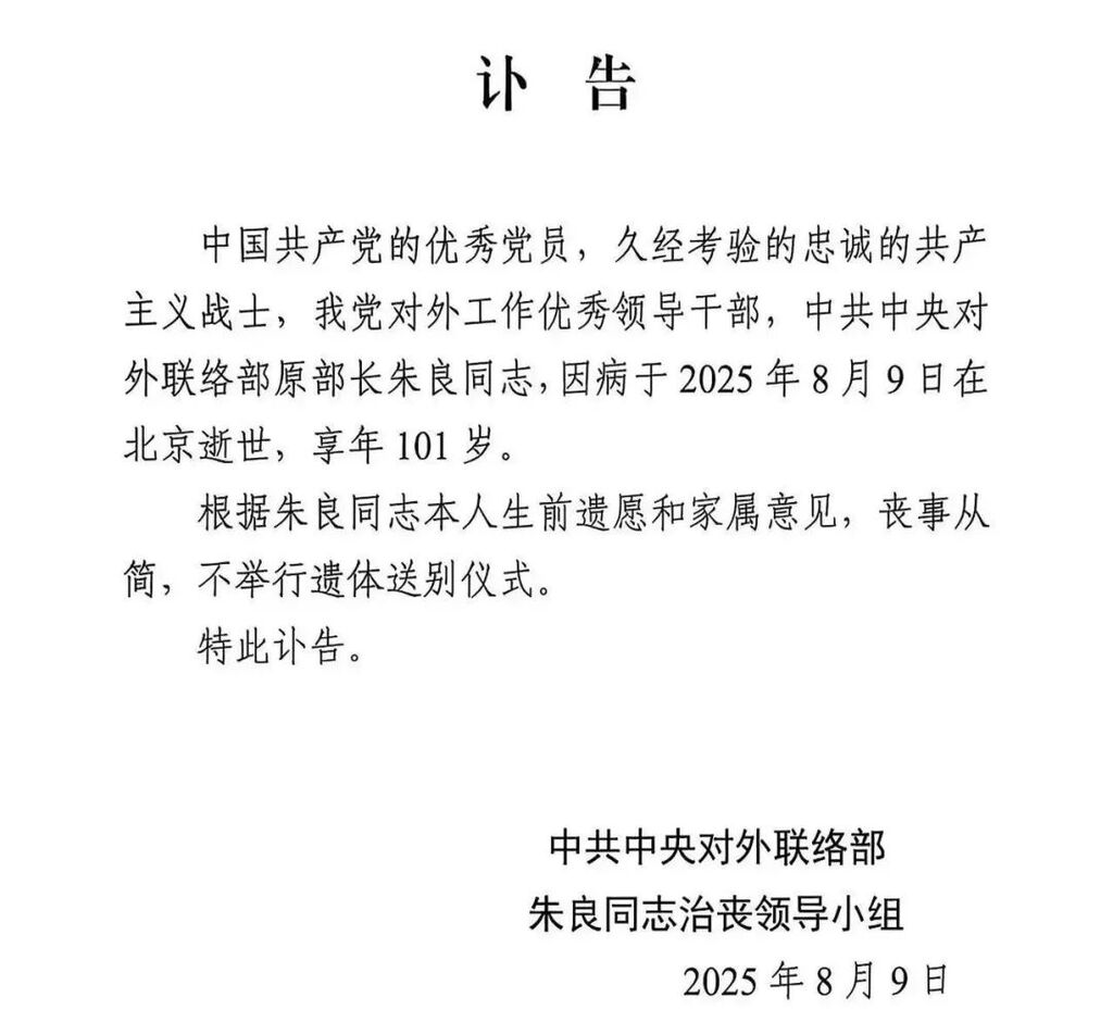 中共中央对外联络部朱良同志治丧领导小组于2025年8月9日发布讣告: