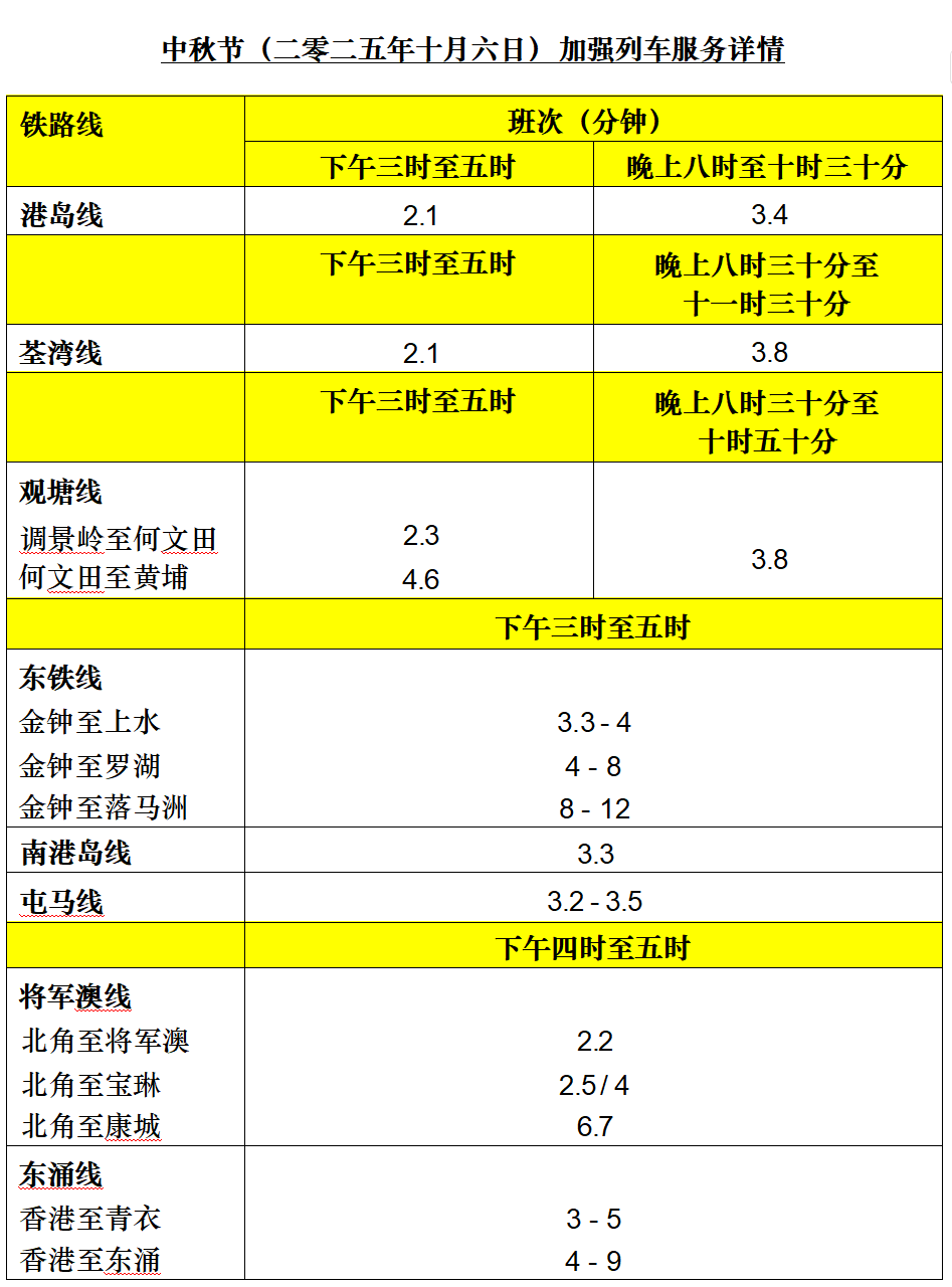 10月6日,港铁本地铁路线(机场快线及迪斯尼线除外)将由当天下午3时起逐步加强列车服务,提早行驶晚上繁忙时段班次。