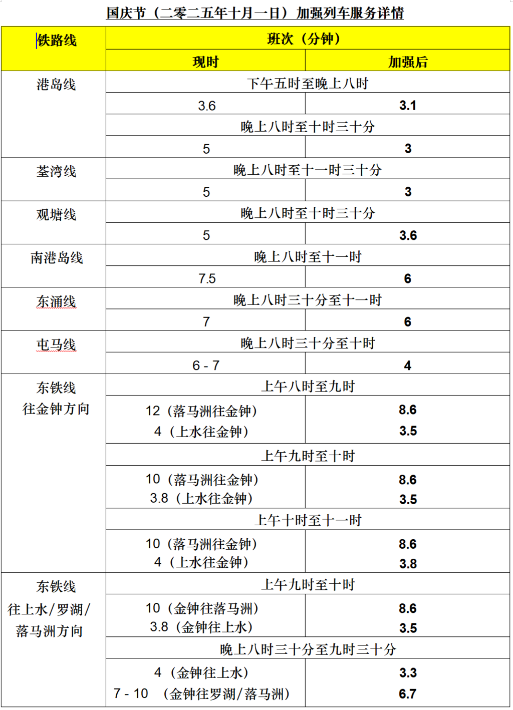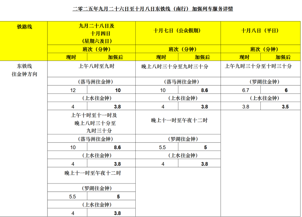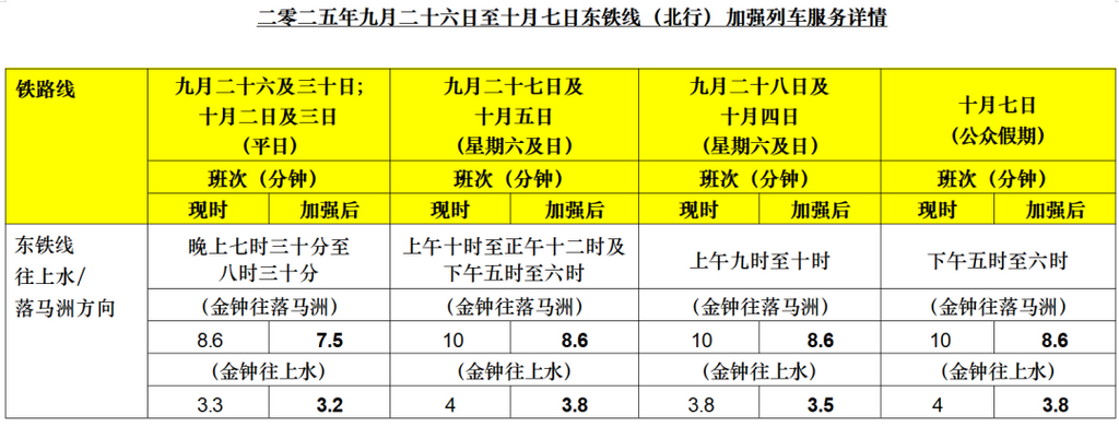 东铁线将在9月26日至10月8日期间,在不同时间与时段加密班次,南行及北行班次均会比平时更频密。