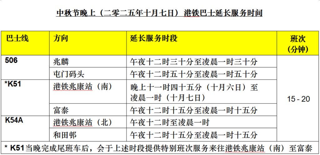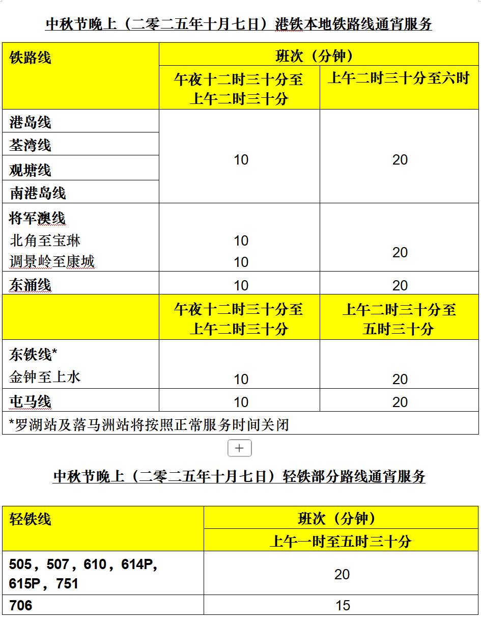 本地铁路线(机场快线、迪斯尼线及东铁线来往罗湖及落马洲站除外)及七条轻铁路线将于中秋节当晚通宵行驶,而港铁巴士506、K51及K54A则会延长服务时间。