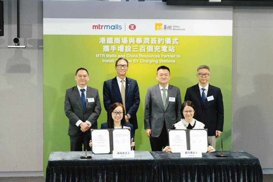 港铁公司与华润集团致力推动可持续发展、回应市民对电动车充电服务的需求,今日(30日)与华润燃气及华润隆地合资的“充美好能源服务有限公司”签订合作合约。将进一步分阶段在多个商场增设近三百个电动车充电站,令数目大幅增加至超过六百个,预计整项工程于明年年中完成。