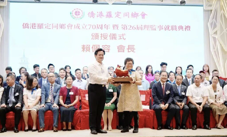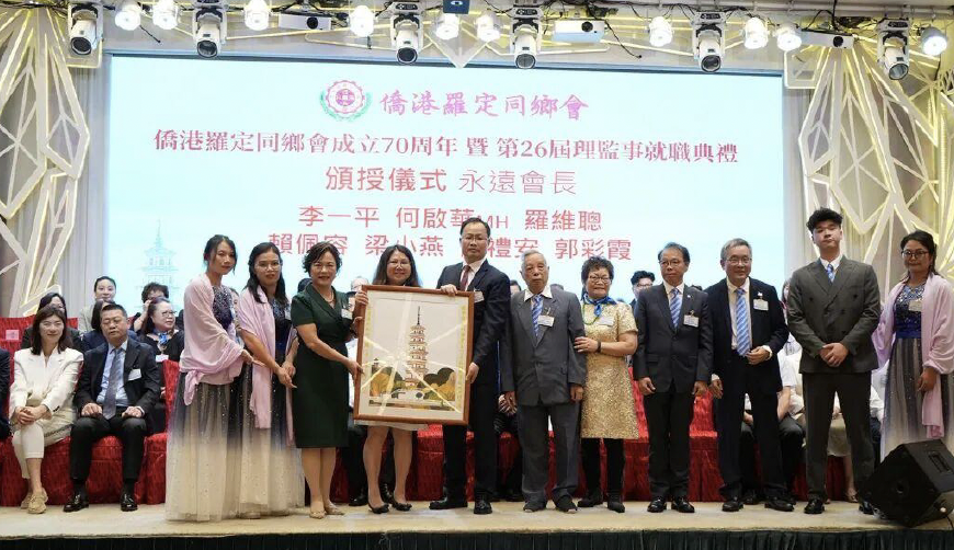 随后举行的就职颁授仪式庄重而热烈。家乡领导依次为新一届理监事会成员颁授就职印鉴牌,并带来了承载著家乡人民深情厚谊的珍贵贺礼,其中包括象征罗定文脉传承的“文塔石画”。同乡会亦回赠感谢状,场面温馨,体现了家乡与香港侨胞之间紧密不可分的情感纽带。