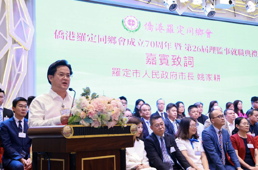 罗定市人民政府市长姚家耕在致辞中充分肯定了同乡会七十年来取得的辉煌成就。他表示,七十载风雨兼程,同乡会始终深植家国情怀,带领乡亲扎根香港、拥护“一国两制”,并心系桑梓,为家乡引进投资、捐资助教。他表示,当前罗定正聚力打造六大百亿产业集群,深南高铁2027年通车后区位优势将更加凸显。他诚挚邀请乡亲常回家看看,亲身感受家乡新貌,继续为家乡招商引资、招才引智。市委、市政府将一如既往优化营商环境,做好服务保障,与广大乡亲携手共绘罗定发展新篇章。