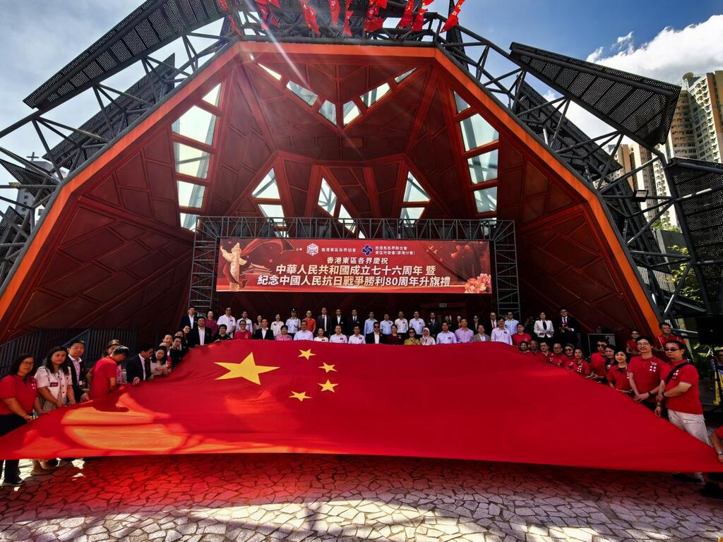 为庆祝中华人民共和国成立76周年,香港东区各界协会、香港岛各界联合会东区地委会(康湾分会)在10月1日于东区文化广场合办“香港东区各界庆祝中华人民共和国成立七十六周年暨纪念中国人民抗日战争胜利80周年升旗礼”。活动现场超过500人组合排列数字“76”,寓意庆祝中华人民共和国成立76周年,伴随著冉冉升起的国旗,全场人员齐声共唱国歌,歌声嘹亮、气势恢宏,将热烈的节日氛围推向高潮。