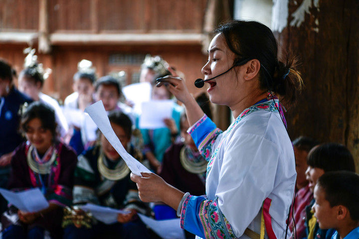 随着国产动画电影《哪吒之魔童闹海》不断刷新中国影史票房纪录,参与电影配乐的贵州省榕江县三宝侗寨的杨想妮和“舞乐蝉歌”团队为更多人所熟知。乐团成员怀揣“用音乐传递侗族文化,让世界听见侗族大歌”的共同梦想,将侗族大歌推向更广阔的舞臺。这是2025年4月22日,杨想妮在贵州省黎平县肇兴镇厦格侗寨教前来研学的孩子们唱侗歌。