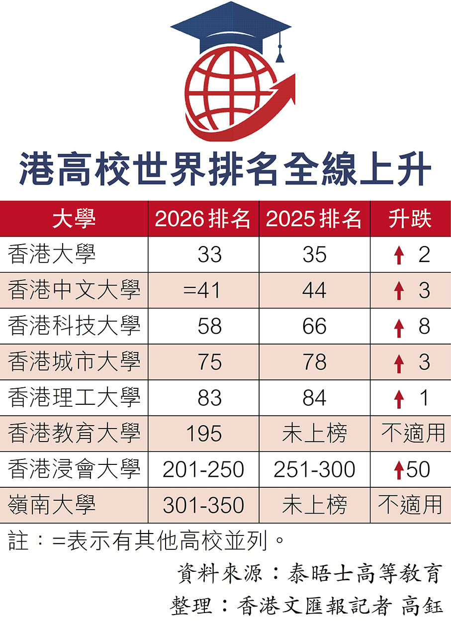 在香港致力发展成为国际教育枢纽的道路上,本港各所大学持续创出佳绩。英国知名教育机构泰晤士高等教育(THE)今天(9日)发布2026年度世界大学排名结果,香港共有8所大学上榜,其中香港教育大学和岭南大学为新上榜,其余6所大学的名次均有所提升,包括3校创下历史最佳排名,令香港成为全球唯一“全线进步”的地区。随着本港5所世界百强大学持续表现出色,加上新上榜的教大一举进占第一百九十五位,香港更首次有6校打入全球200强,尤以香港大学排第三十三最高。THE分析指,香港正加大对学术人员及博士研究的投入力度,造就教学声誉及相关表现的提升,是排名创佳绩的关键。