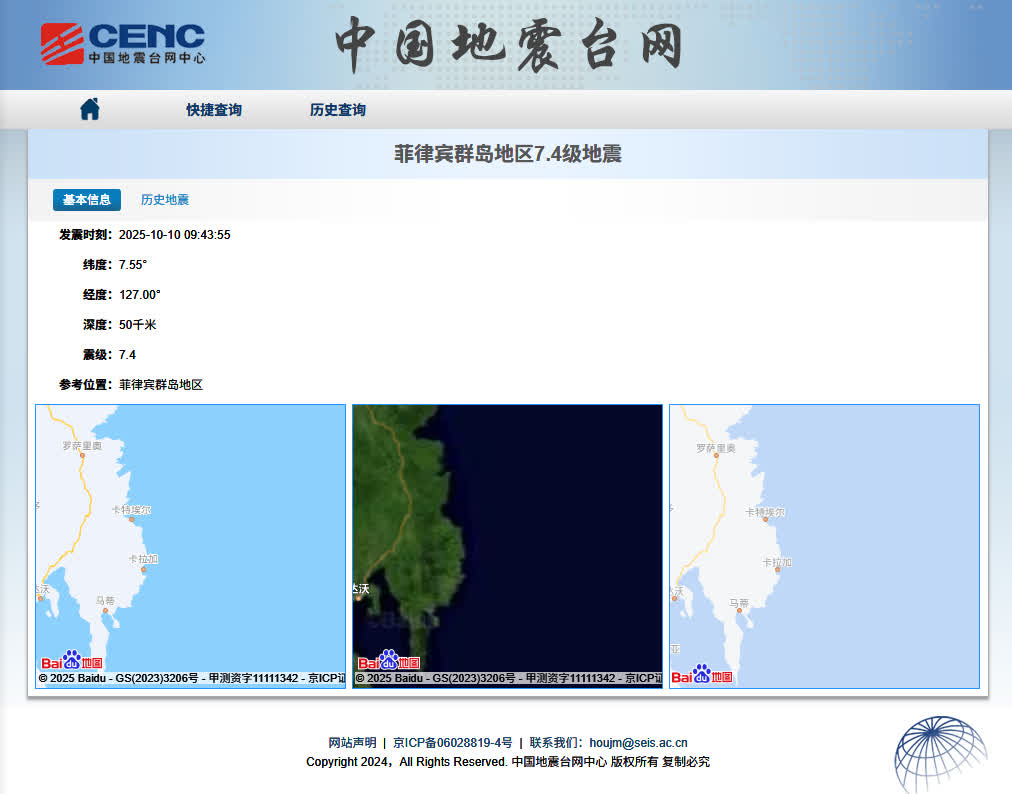 据综合报道,菲律宾发生7.4级地震。据中国地震台网正式测定:10月10日09时43分在菲律宾群岛地区(北纬7.55度,东经127.00度)发生7.4级地震,震源深度50千米。