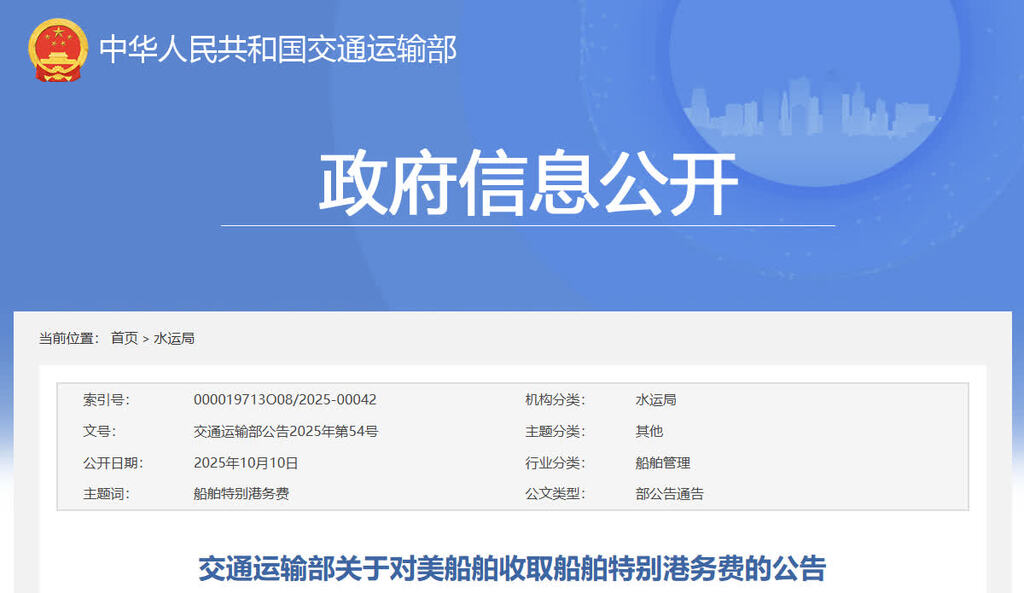 据交通运输部网站消息,2025年4月17日,美国贸易代表办公室发布关于对中国海事、物流及造船业301调查措施,自2025年10月14日起,将对中国企业拥有或经营的船舶、中国籍船舶及中国造船舶加收港口服务费,严重违背了国际贸易相关原则和中美海运协定,对中美间海运贸易造成严重破坏。