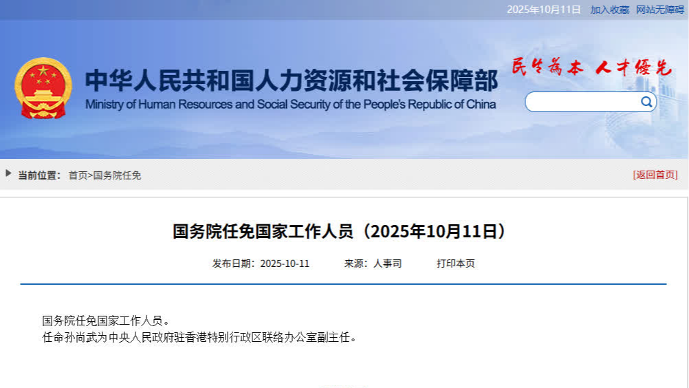 人社部网站10月11日消息,国务院任免国家工作人员:
