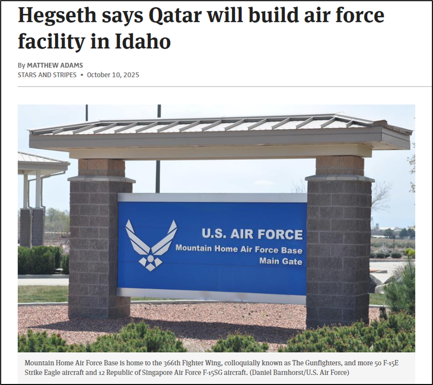 据美国《星条旗报》报道称,该设施拟建于美国空军“山地之家”基地,供卡塔尔F-15战斗机飞行员提升与美军的联合行动能力。美国国防部长赫格塞思及卡塔尔驻美使馆共同表示,建设资金将由卡塔尔承担。卡塔尔方面强调,设施将由美军负责管理,该国从未试图在美国建立军事基地。