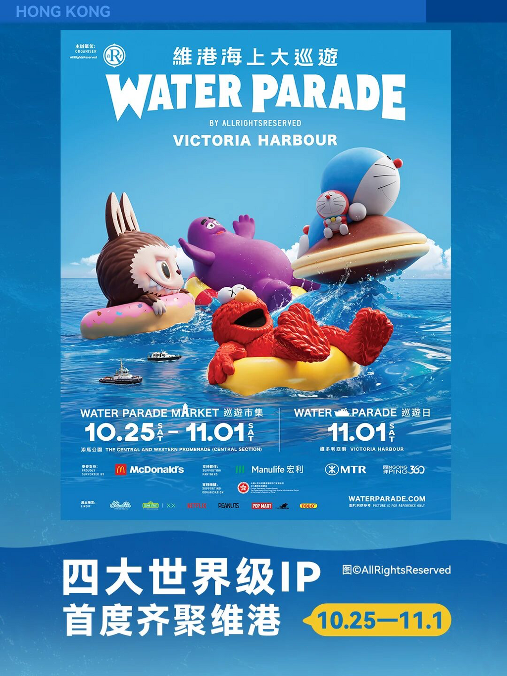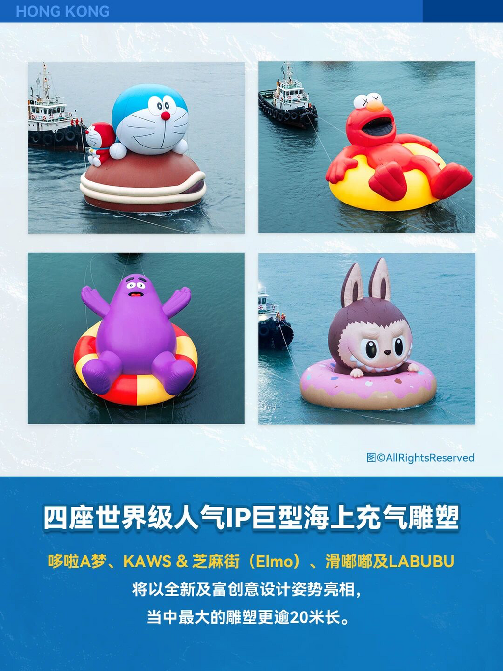 活动首次汇聚四大来自不同领域的世界级人气IP,包括陪伴我们成长的哆啦A梦、潮流艺术代表KAWS & 芝麻街的Elmo、麦当劳人气王滑嘟嘟,以及风靡全球的LABUBU,将于10月25日起以巨型充气雕塑形式惊艳亮相维多利亚港,并于11月1日组成史上最梦幻的巡游舰队,穿梭于九龙与香港岛之间,为维港绘制一幅充满童趣与活力的全新画卷。
