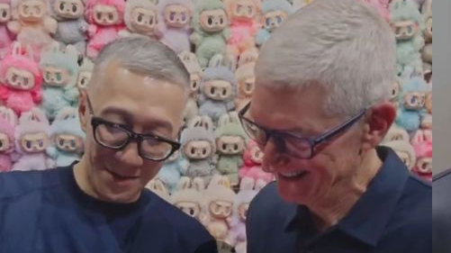 内媒报道,库克访华首站并非苹果门市,而是泡泡玛特在上海举行的LABUBU十周年巡展,设计者龙家升向库克展示在iPad Pro上绘制LABUBU;王宁亦向库克赠送一个手持iPhone 17 Pro、带上黑色粗框眼镜的白毛LABUBU。