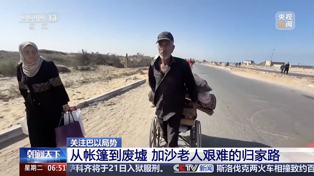 60多岁的纳伊尔·阿巴斯和妻子曾在难民营帐篷里避难,随着加沙地带停火协议第一阶段的生效,他们拉着堆满家当的小推车,徒步回家。夕阳西下,终于回到加沙城,但眼前的景象,击碎了他们最后的希望,“没想到整栋楼都塌了”。夜幕降临,他们只能在废墟中生火、铺床。“我们该怎么办?”炮火虽然暂歇,但加沙人的生存之战,还远未结束。