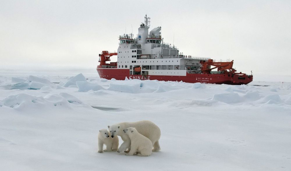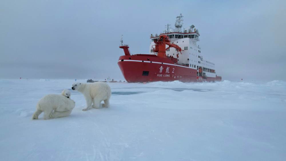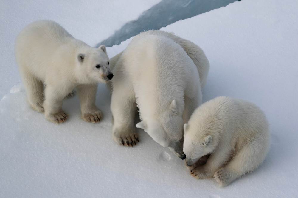 8月30日夜,在距离考察队长期冰站作业结束还剩一天时,一只北极熊妈妈带着两只熊宝宝出现在了考察队员搭乘的“雪龙2”号极地科考破冰船船边。
