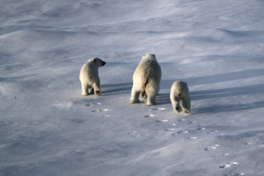 8月30日,长期冰站第5天。当天23时16分,驾驶台值班船员贾沛楠查看船舶周围动态时,发现1只北极熊妈妈带着2只熊宝宝出现在船左舷后方约1海里处。