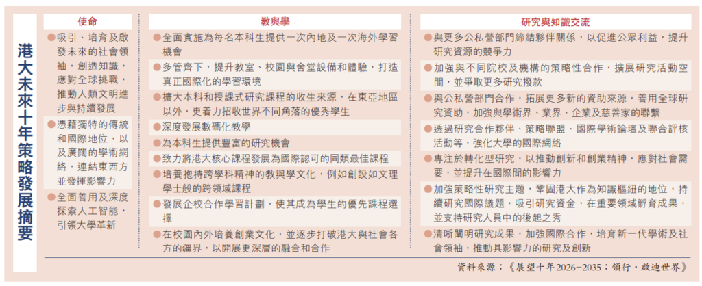 香港大学昨日公布策略发展计划《展望十年2026-2035:领行·启迪世界》,为大学未来十年的发展制定战略蓝图和发展方向。计划订明,港大的愿景是成为引领人类未来的世界级大学,强调要善用及深度探索人工智能(AI),引领大学革新,并会凭借独特的传统和国际地位,以广阔的学术网络,连结东西方并发挥影响力。为此,港大将全面实施为每名本科生提供内地及海外各一次学习交流的机会,并会更着力招收东亚地区以外,世界不同角落的优秀学生,致力打造真正国际化的学习环境,深度发展数码化教学等,多方面支持港大成为全球顶尖大学。