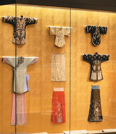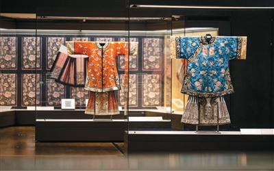 第二单元“百紫千红”展示了清代的阑干、月华、凤尾及百褶鱼鳞裙,辅以袄、褂及马面绣片等,呈现了清代丰富的裙型与华美的装饰。