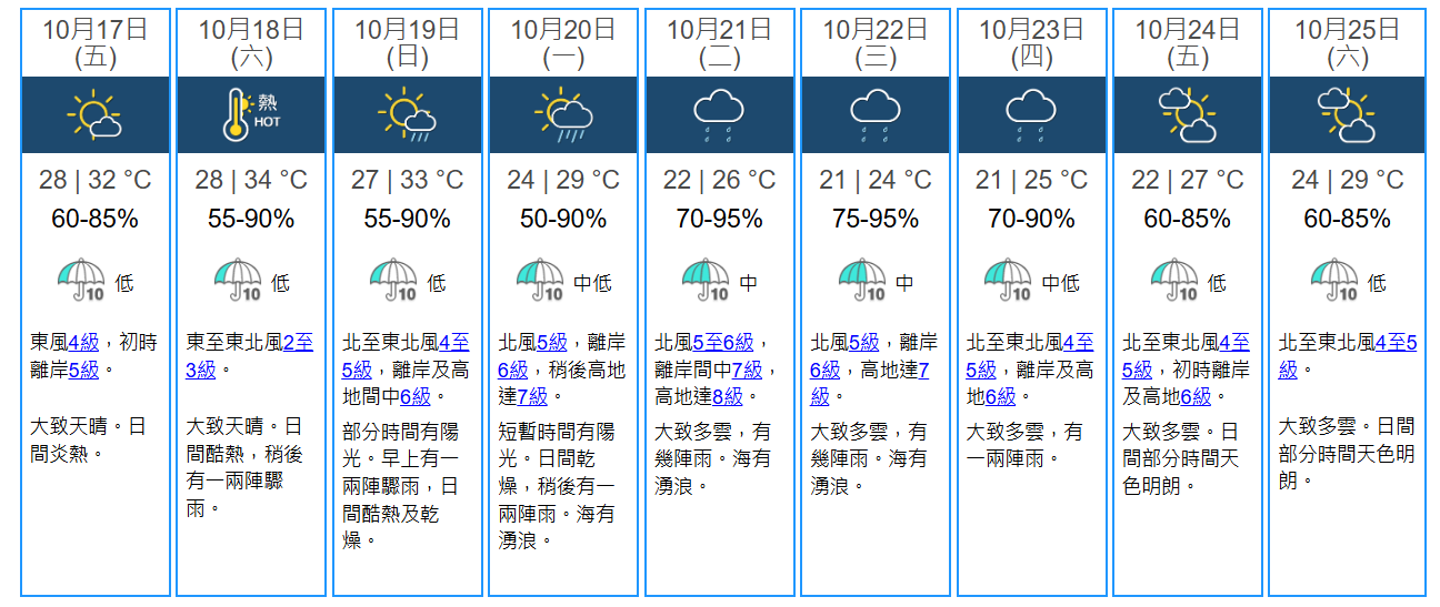 根据天文台的九天天气预报,预测下星期二及星期三(21日及22日)大致多云,有几阵雨。海有涌浪。下星期二最低气温22度,北风5至6级,离岸间中7级,高地达8级。下星期三最低气温降至21度,高地风力仍达7级。下星期四(23日)最低气温21度,大致多云,有一两阵雨。