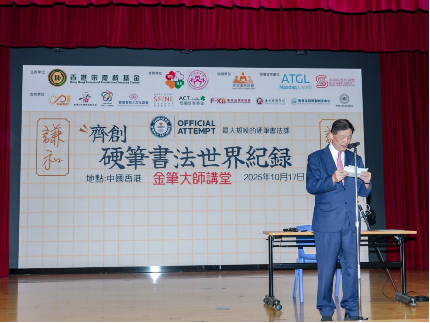 2025年10月17日,梁显利油麻地社区中心洋溢著浓厚的文化氛围与青春活力。由香港宋庆龄基金、We Like Hong Kong、沪港妇女会主办、民政事务总署协办的“金笔大师讲堂——齐创硬笔书法世界纪录”活动在此隆重举行,来自香港油尖旺区多间中、小学的291名学生齐聚一堂,以笔墨寄情、以书法传意,顺利完成一场意义非凡的硬笔书法课,成功挑战并创下“最大规模硬笔书法课”健力士世界纪录TM,为庆祝中华人民共和国成立76周年,献上一份蕴含中华文化底蕴的珍贵礼物。由中联办教育科技部叶水球副部长、香港特别行政区政府油尖旺民政事务专员余健强先生担任活动主礼嘉宾。