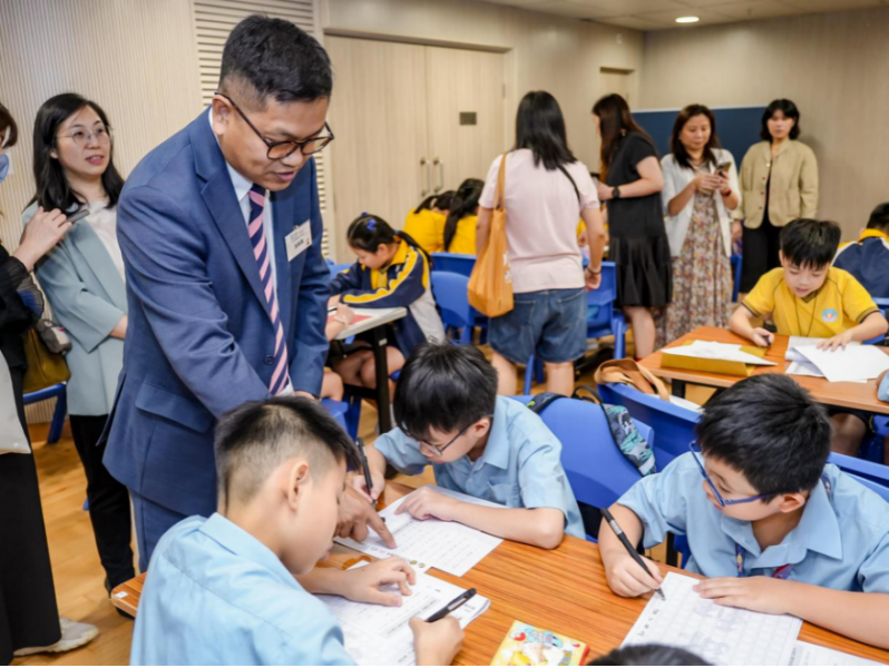 随后,健力士世界纪录TM认证官,以严谨的态度详细说明挑战规则:需确保参与者人数达标、课程时长符合标准、书法教学具备专业性,且全程在见证官与监督员的即时监督下进行。规则宣读完毕,全场学生在老师们的指导下开始书写。现场,学生们专注的眼神、认真的姿态,构成一幅生动的“书法图”,充分展现香港青少年对传统文化的热情与敬意。最后,全体学生顺利完成硬笔书法课程,为挑战交出圆满答卷。