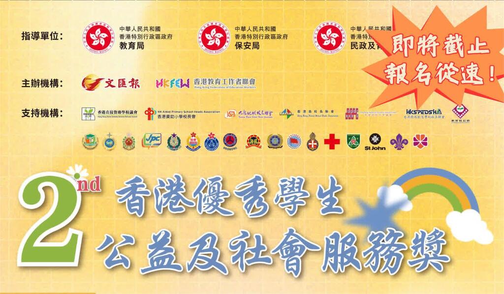 第二届“香港优秀学生公益及社会服务奖”评选现正接受报名,即将于至10月31日截止,评选工作将于11月进行,并于12月13日举行颁奖典礼。评选将分为小学组和中学组,设有杰出服务奖、优异服务奖、优良服务奖、嘉许奖及积极参与服务学校奖等多个奖项,评选标准分为校内操行、校内服务、校外服务、学生感言四个部分。参与学生需提交2023年9月至2025年10月期间的公益服务证明,并按规定将申请文件合并为单一PDF档案上传。